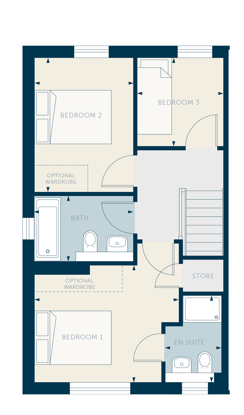 The L-shaped upper hallway leads to three bedrooms and elegant family bathroom. The main bedroom has en suite shower facilities and additional storage. There is an option for built-in wardrobes in the main and second double bedroom and the third room could be used as a nursery, child’s single or home office.