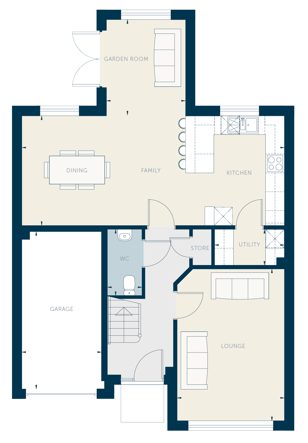 This perfect family home with integrated garage has a bright, spacious entrance hallway with downstairs WC and useful storage cupboard. The open plan dining kitchen stretches the entire length of the home, giving lots of space for family life and entertaining. The utility area off the kitchen keeps everything tidy and organised. The garden room next to the dining area with its French doors to the private back garden brings the outdoors in and gives families even more space.