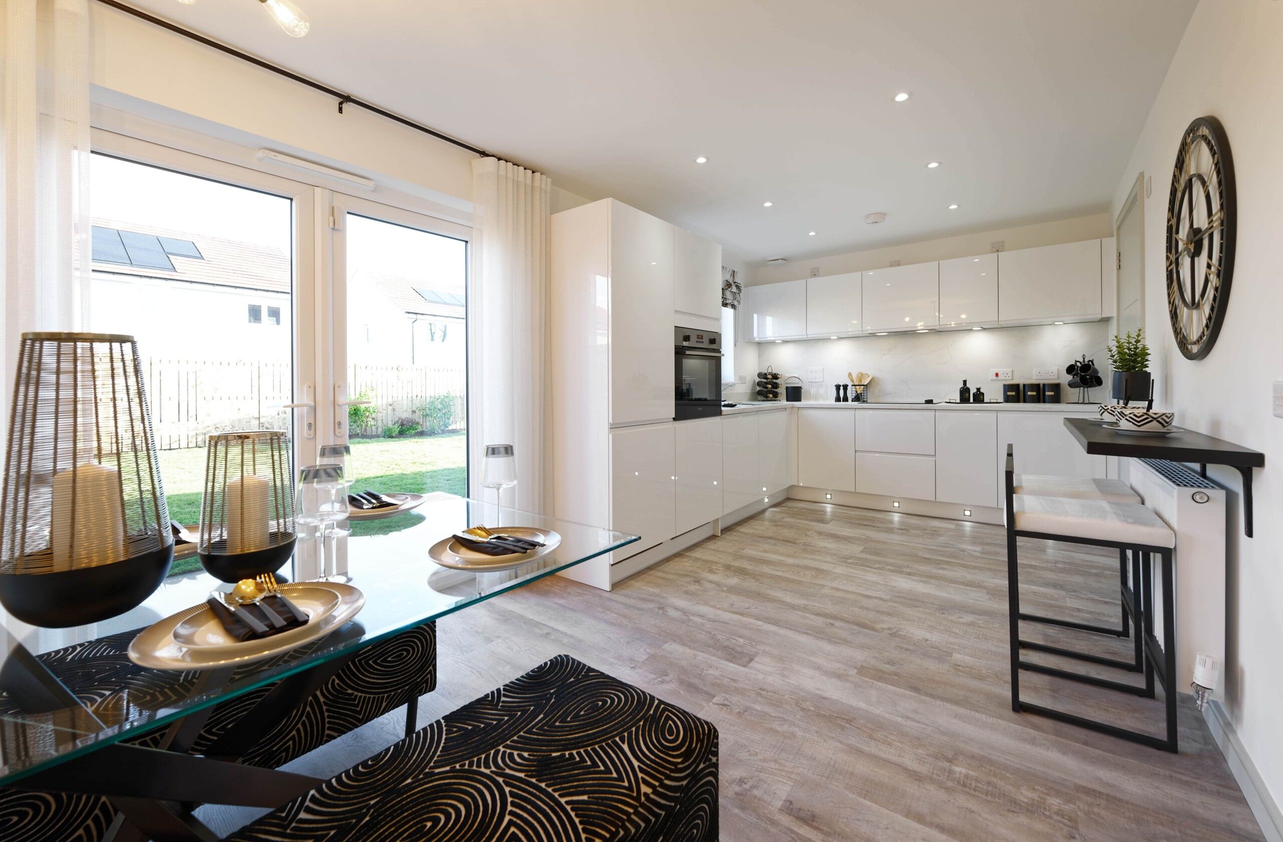 A rectangular hallway gives line of sight through the Lisbon. French doors in the open plan kitchen/dining room and deep windows in the elegant lounge keep the home bright and welcoming. Modern family life is supported by a separate utility area, storage and downstairs WC.