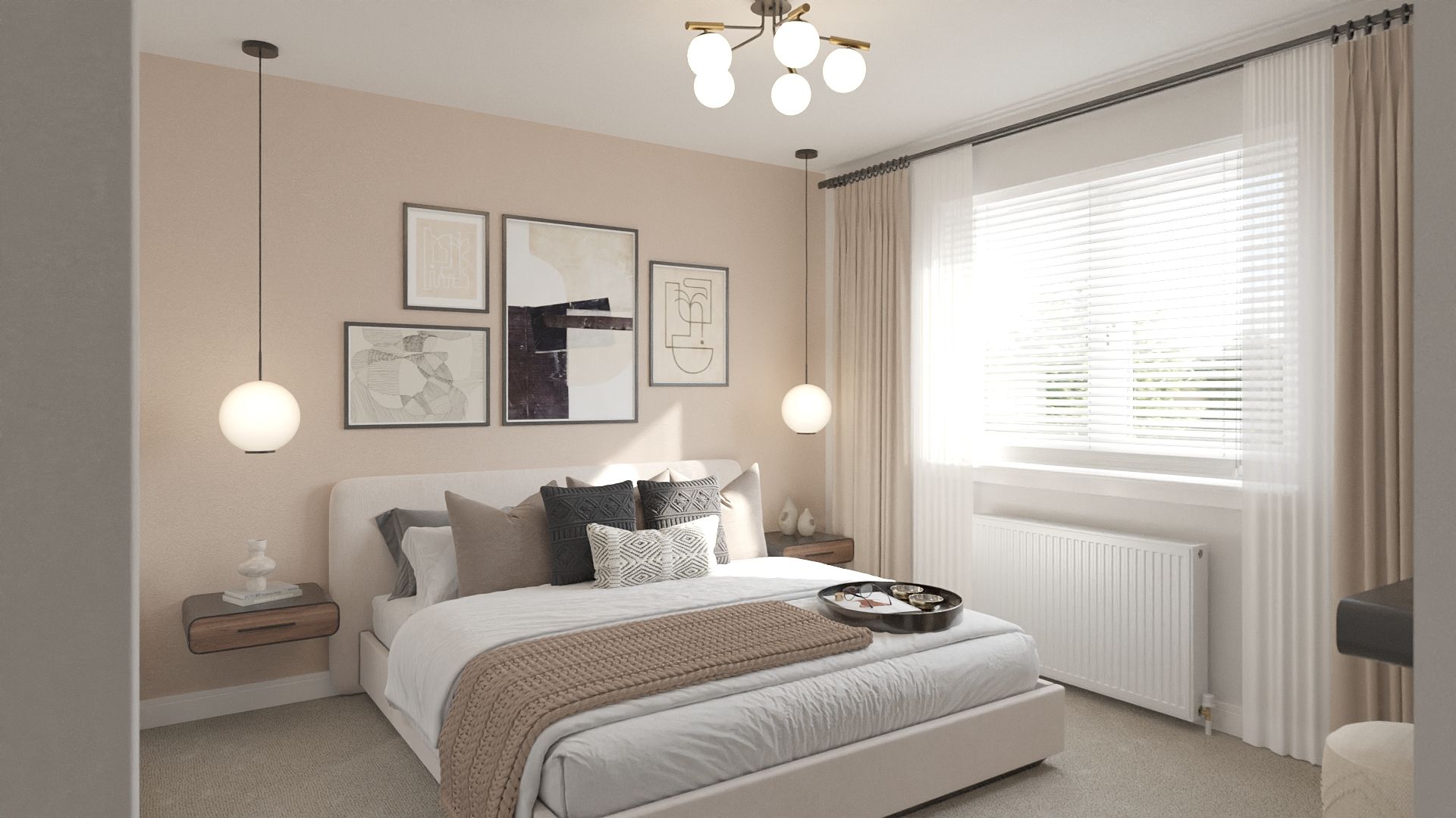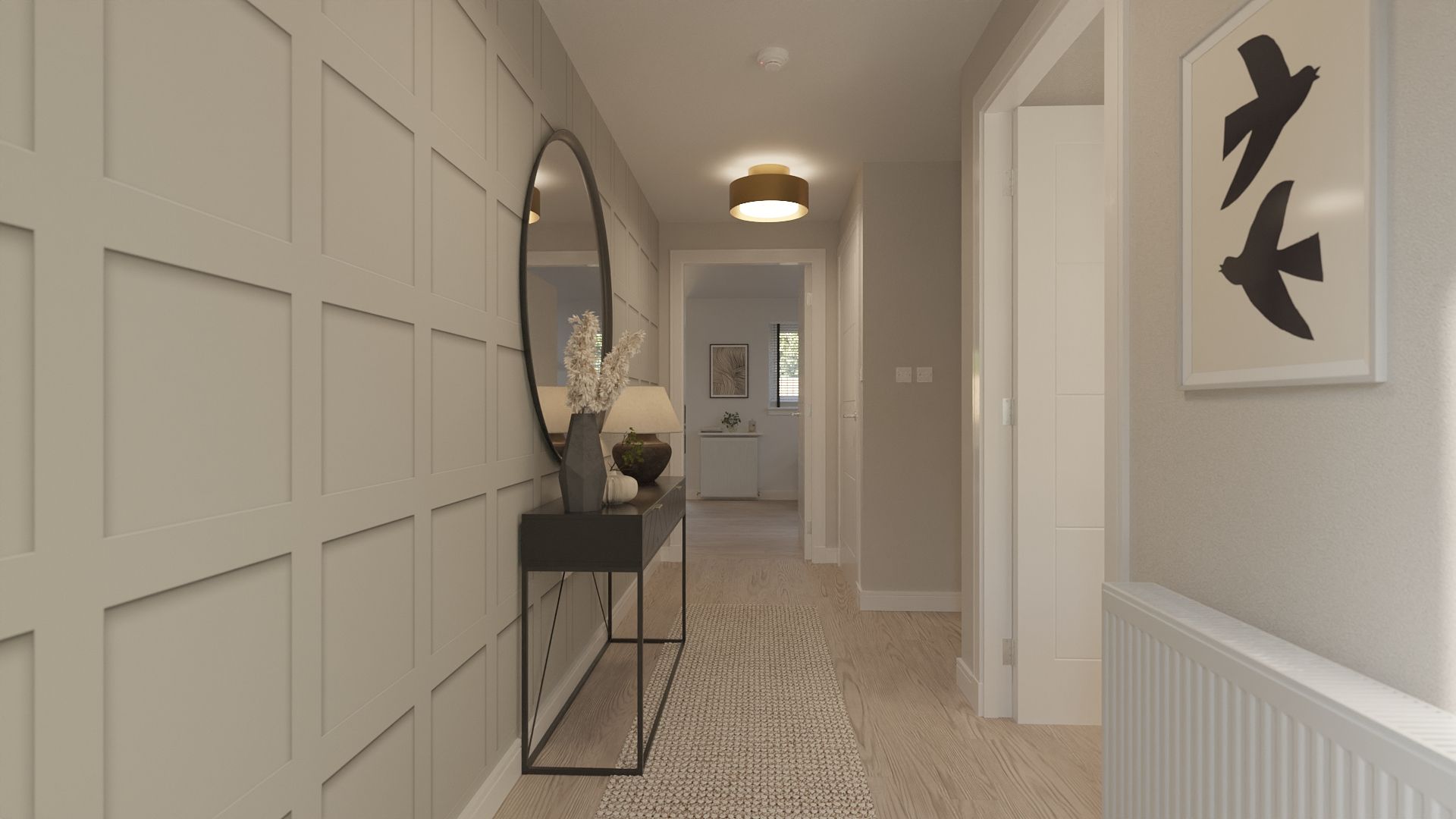 A spacious hallway upstairs has a useful large cupboard and leads to the main family bathroom and four double bedrooms. The main bedroom has a stylish en suite and built-in wardrobe, the second and third double bedrooms have optional built-in wardrobes and the fourth bedroom could equally function as an office or nursery.